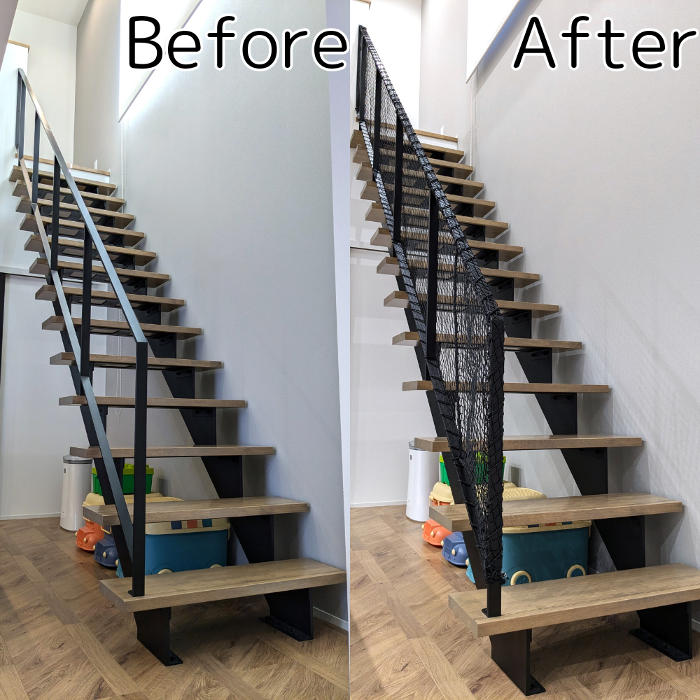 階段の手すりにネットを取り付けたことで、息子も顔を出すこともなくなり、一安心しているところです(相変わらず手は振ってくれるし可愛い)。