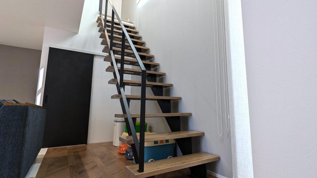 我が家の階段はリビングに併設された直線階段です。しかもスケルトン仕様。