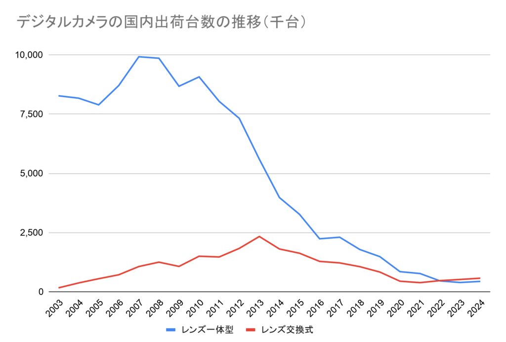 そして、近年では一眼レフやミラーレスなどのレンズ交換式のカメラよりも下回る状況です。
