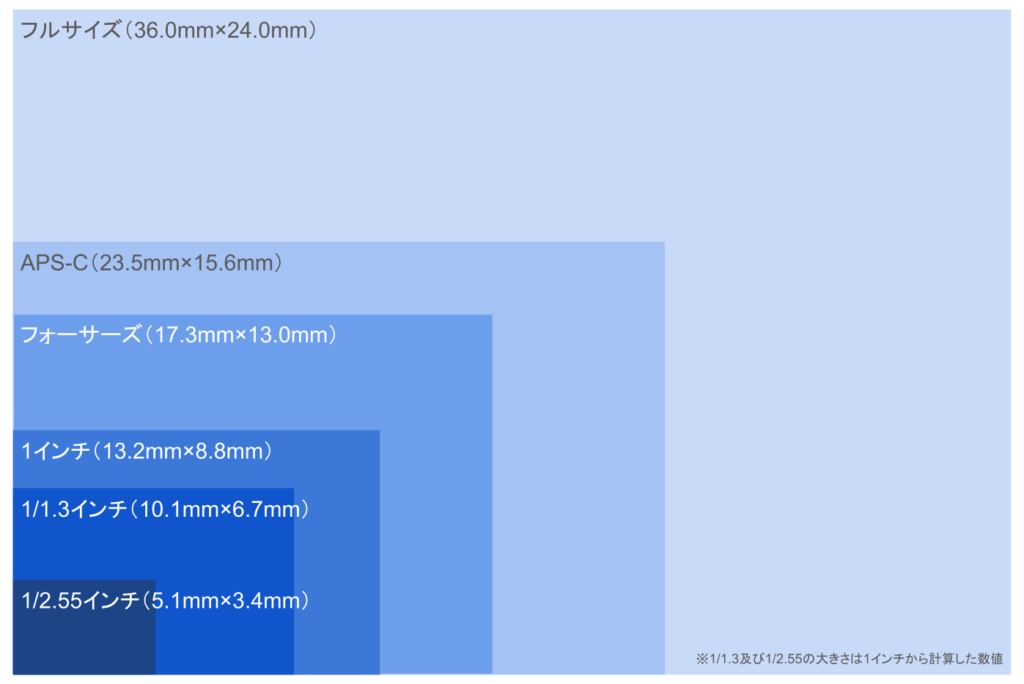 一般的なカメラに搭載されているセンサーサイズは以下のとおり。